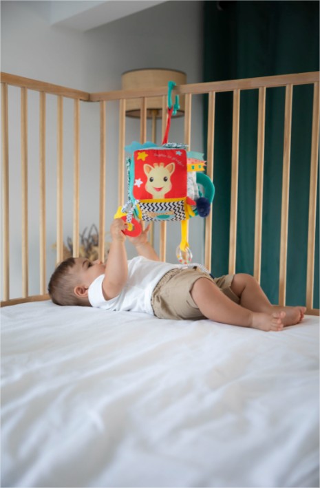 Разполага с обезопасена кука, която може да се закачи навсякъде (в креватчето, количката и др.) и да придружава вашето бебе навсякъде и по всяко време на деня.