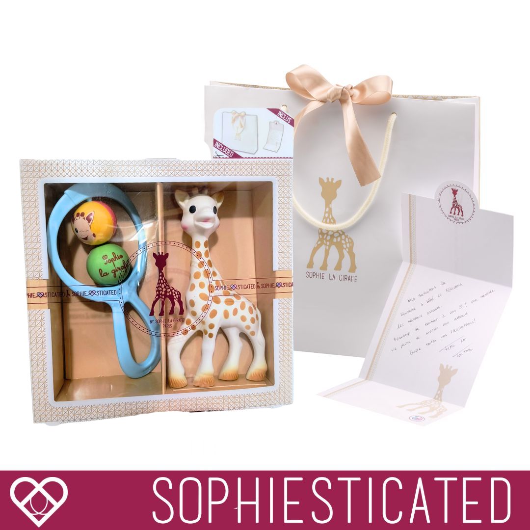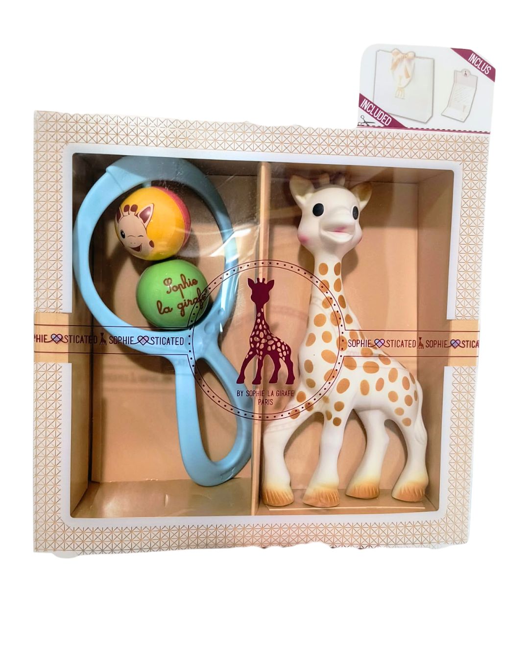 Този красив подаръчен сет включва любимата Софи, направена от 100% естествен каучук, напълно натурална и безопасна играчка за бебета и класическа дрънкалка с ярки цветове, които привличат вниманието на бебето. Когато се разклати дрънкалката започват да издава пряитен, ненатрапчив звук. Много лека и лесна за хващане от детските ръце.