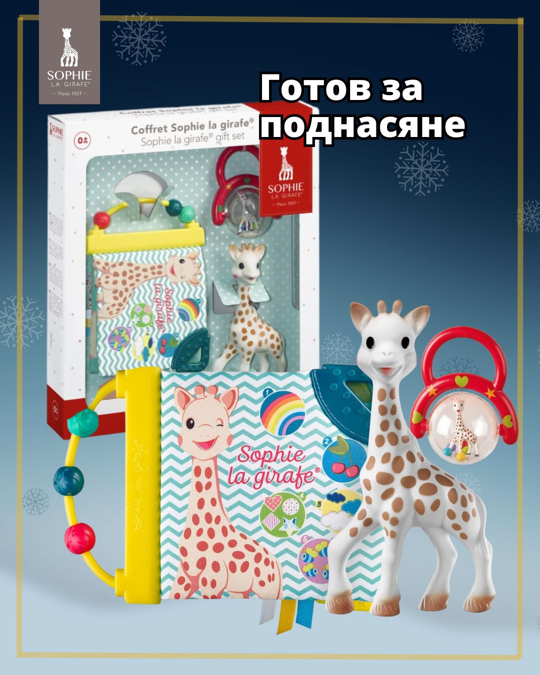 Жирафчето Софи – класическа играчка, обичана от поколения бебета вече над 50 години. Изработена от естествен каучук и натурални оцветители, Софи е мека на допир, издава приятни звуци и помага за облекчаване на никнещи зъбки.