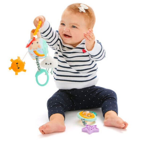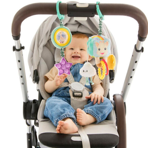 Практичен комплект от 2 висящи играчки, създаден да забавлява и стимулира бебето още от първите месеци. Лесно се закачат за количка, кошче, легло или активна гимнастика и са идеални за разходки и пътуване.
