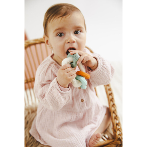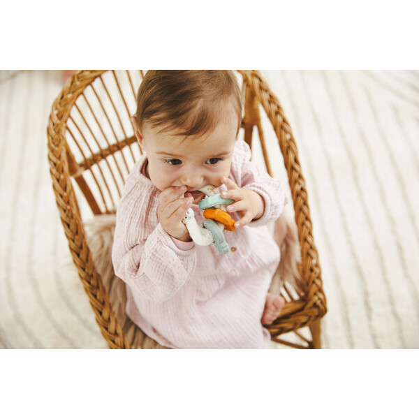 Състои се от ергономично проектиран ринг и три цветни, релефни „пръстена“, специално създадени, за да облекчат венците и да стимулират сетивата на детето.
