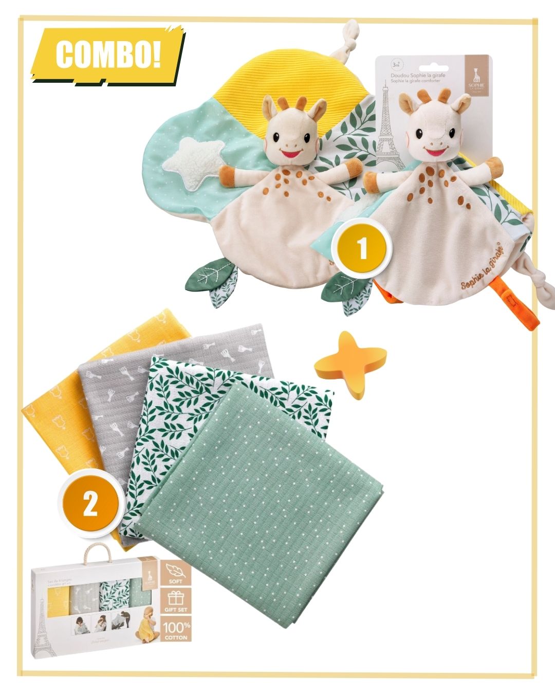 Този специален комбо сет съчетава два незаменими продукта за първите месеци на бебето, създадени с мисъл за комфорт, сигурност и нежна грижа – памучни пелени от 100% памук и утешител за успокоение със Софи Жирафчето, обединени в един хармоничен дизайн.