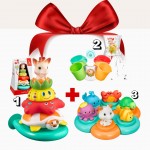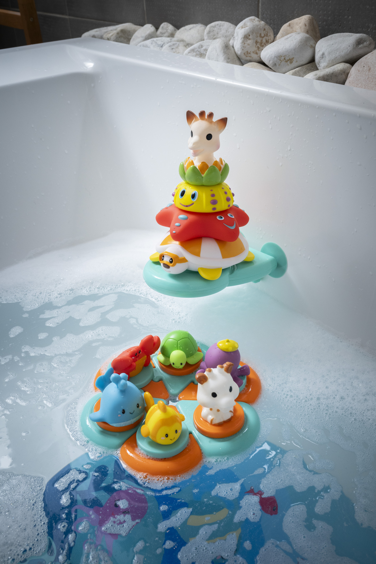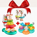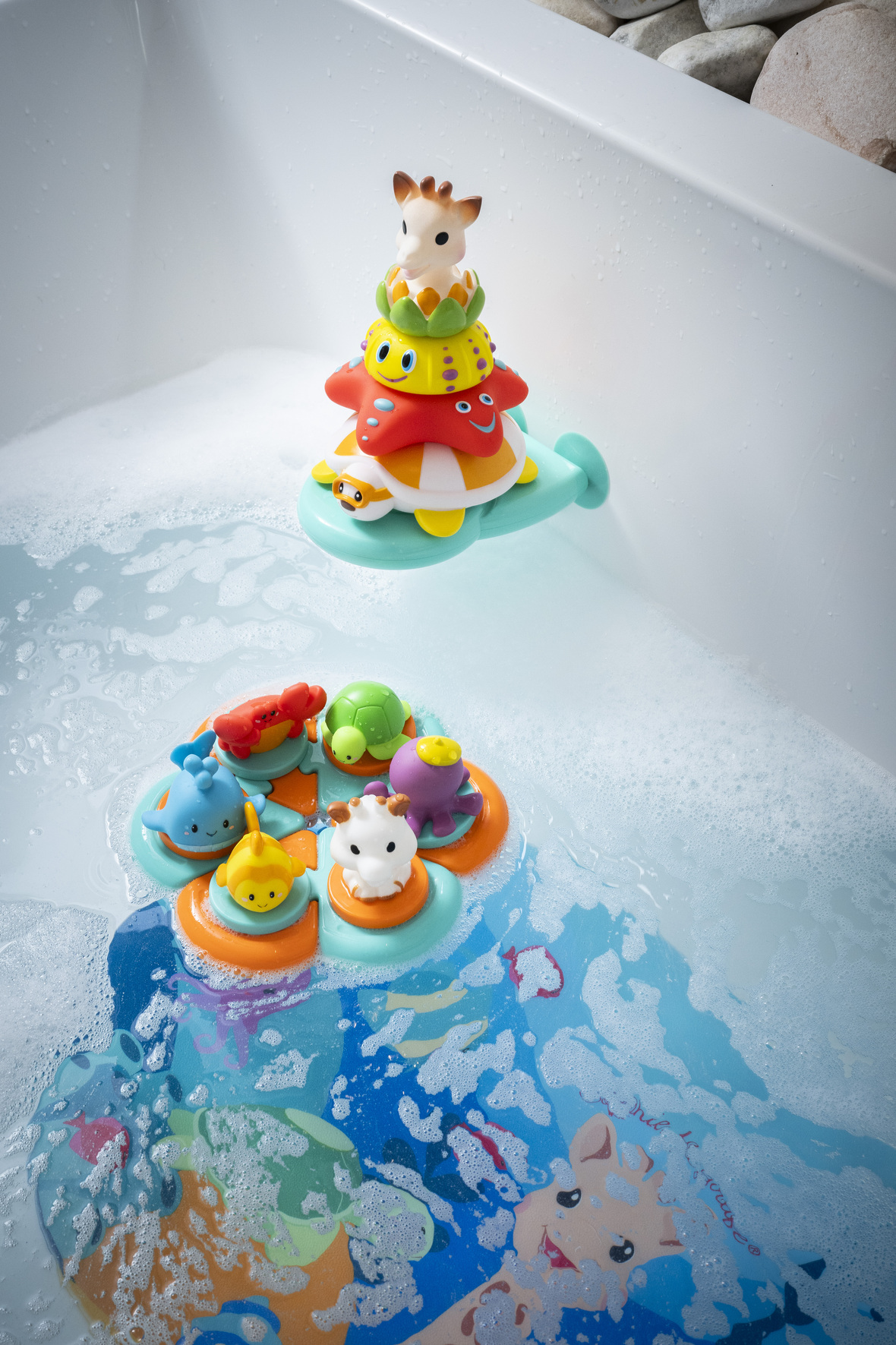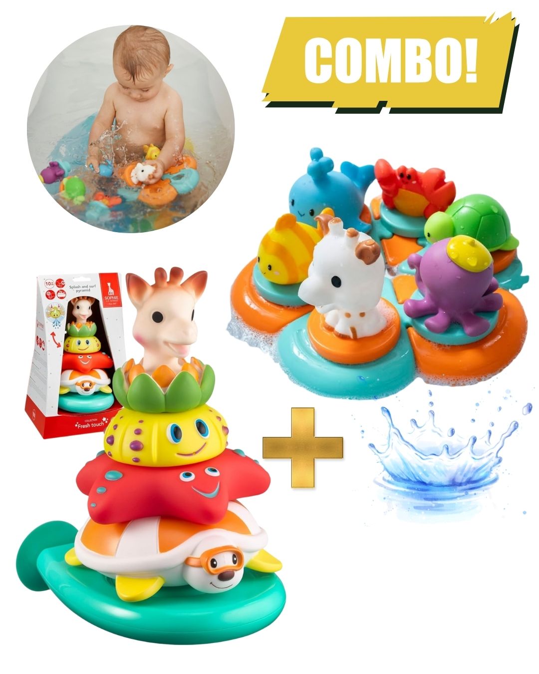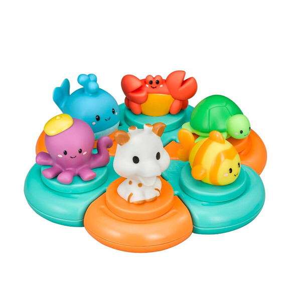 ✨ С този комбиниран комплект за баня времето за къпане се превръща в уникален момент за учене и забавление, който развива сетивата, моториката и креативността на вашето дете, докато се наслаждава на любимите си герои от Sophie la Girafe.