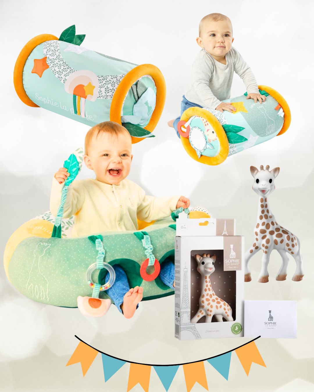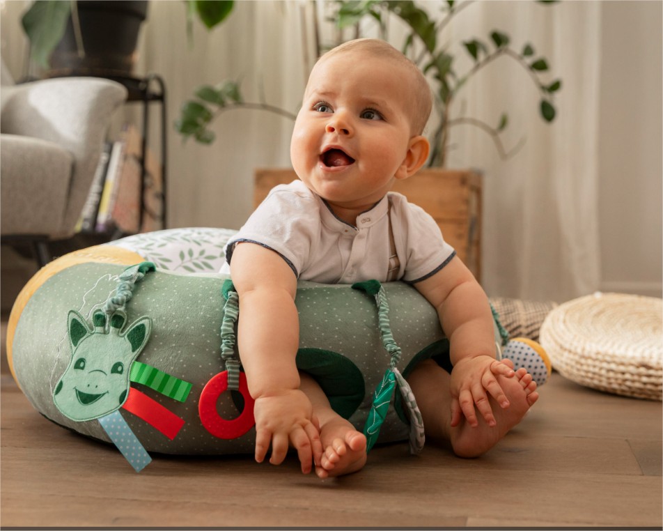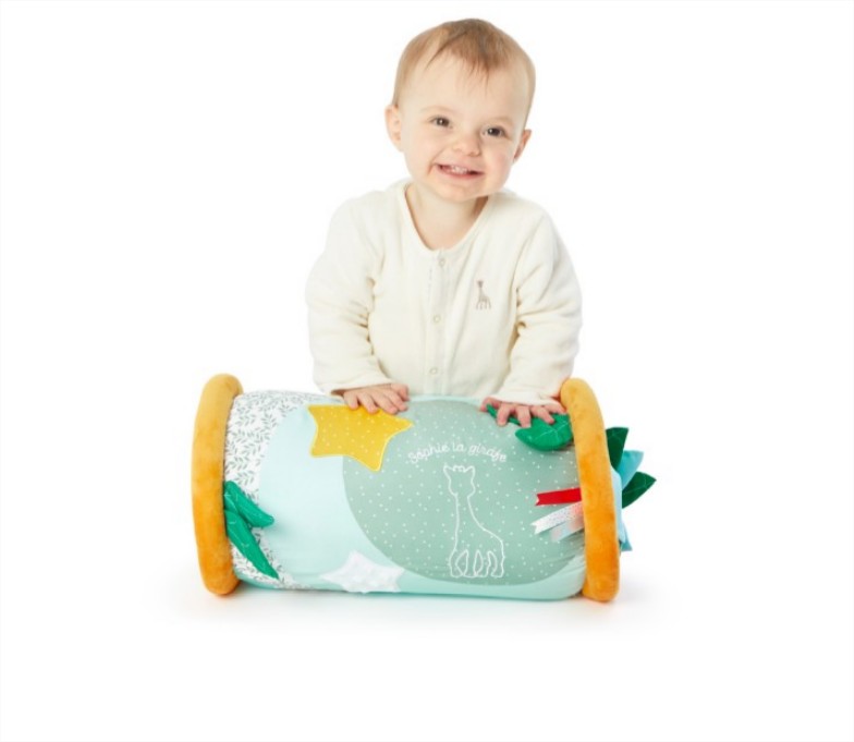 2️⃣ Rollin' от серията Sophie la Girafe – супер мек, с разнообразни активности по цялата повърхност: огледало, гризалка, дрънкалка и различни текстури. Подпомага самочувствието на бебето и го насърчава да пълзи и да стои.