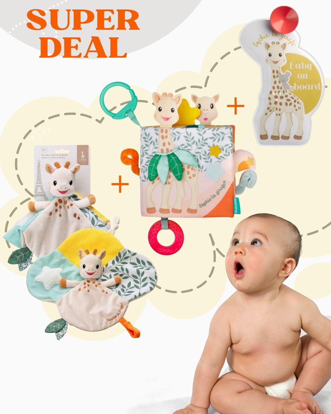 Този внимателно подбран бебешки комплект със Софи Жирафчето съчетава всичко необходимо за комфорта, развитието и безопасността на вашето бебе – у дома, по време на игра и при пътуване. Идеален избор за подарък за новородено или за първите месеци от живота на мъничето.