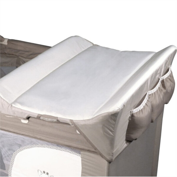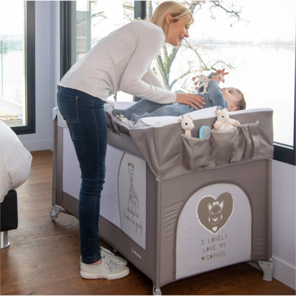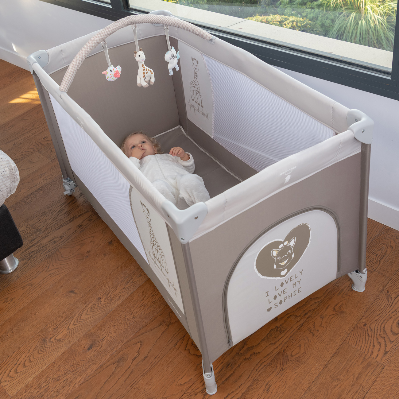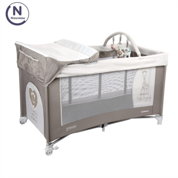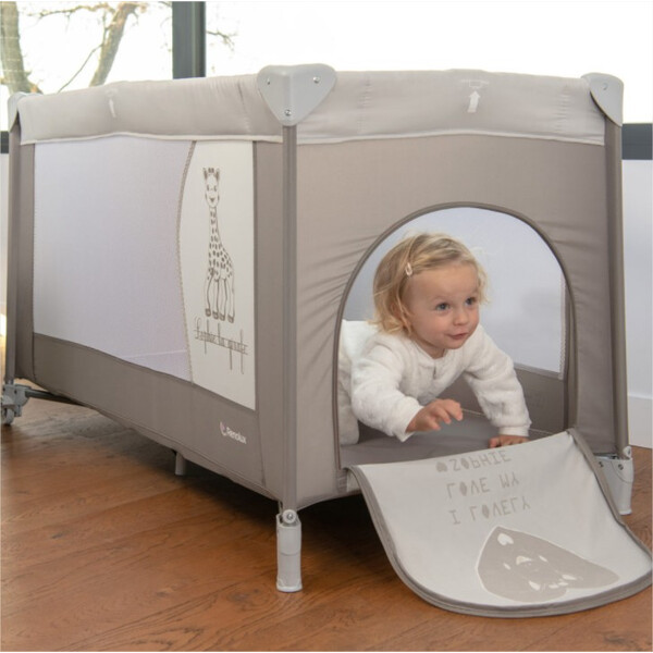 Сгъваема кошара на две нива SOPHIE SUNRISE – безопасно и удобно място за сън и игра, със забавни играчки, подвижна подложка за повиване и лесно сгъване за транспорт.
