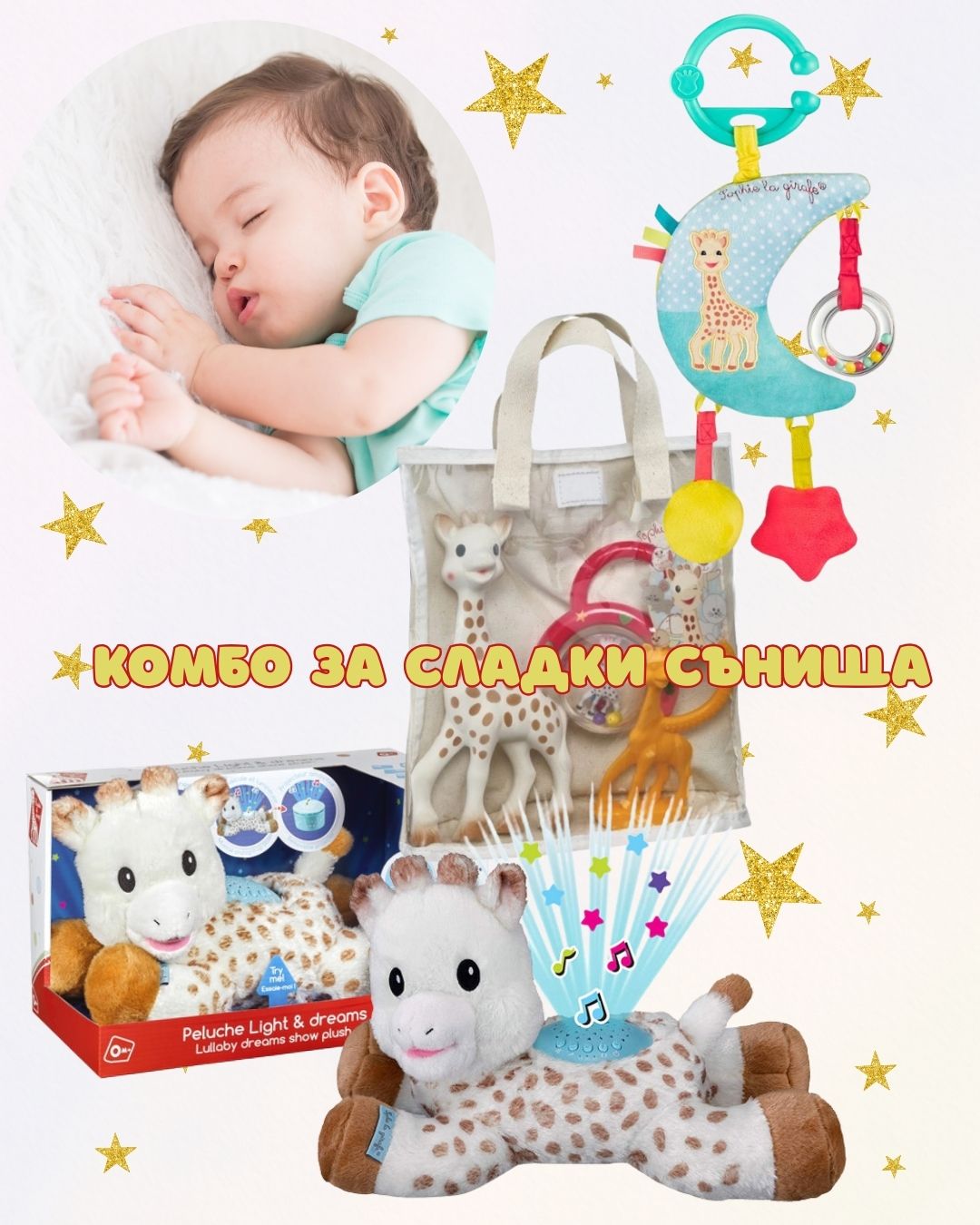 Подарете на вашето бебе комплексно изживяване за сетивата, забавление и спокоен сън с този специален комбо сет, който съчетава плюшена Софи с проектор и музика, сенсорни играчки за ранно развитие и нежна луничка с мелодии.